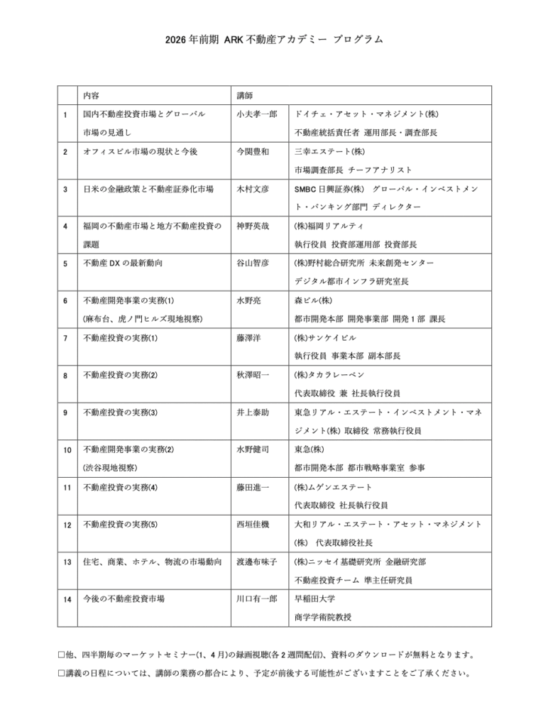 ARK不動産アカデミーでは、2026年前期講座(1月-6月)と、1月不動産マーケットセミナーのお申し込みを受付中です。